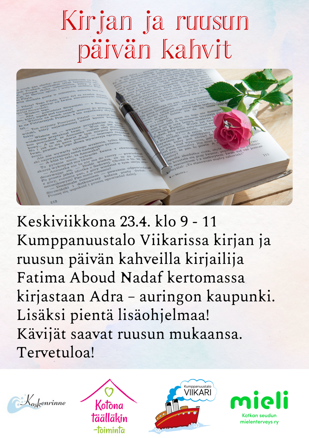 Kirjan ja Ruusun päivän kahveilla Viikarilla klo 9-11 kirjailija Fatima Aboud Nadaf kertoo kirjastaan Adra – auringon kaupunki. Lisäksi luvassa pientä lisäohjelmaa. Tervetuloa, kaikki kävijät saavat…