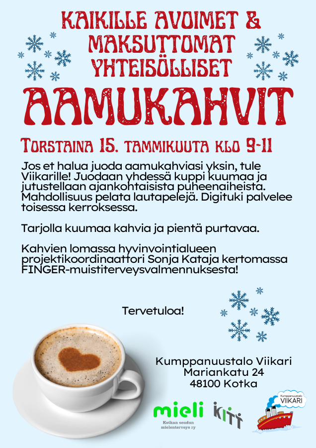 Ota talteen kevään 2026 Yhteisöllisten aamukahvien aikataulu Kumppanuustalo Viikarilla kerran kuussa torstaisin klo 9-11!