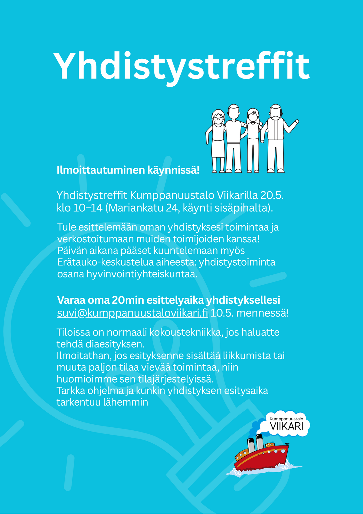 Ilmoittautuminen Kumppanuustalo Viikarilla 20.5. klo 10–14 järjestettäville yhdistystreffeille on käynnissä! Jos haluatte tulla esittelemään n. 20min ajaksi toimintaanne, ilmoittautukaa suvi@kumppanuustaloviikari.fi 10.5. mennessä. Tänä vuonna tarkoituksena on, että mahdollisimman moni yhdistys pääsisi esittelemään omaa toimintaansa ja vastaavasti tutustumaan toisten toimintaan sekä verkostoitumaan.