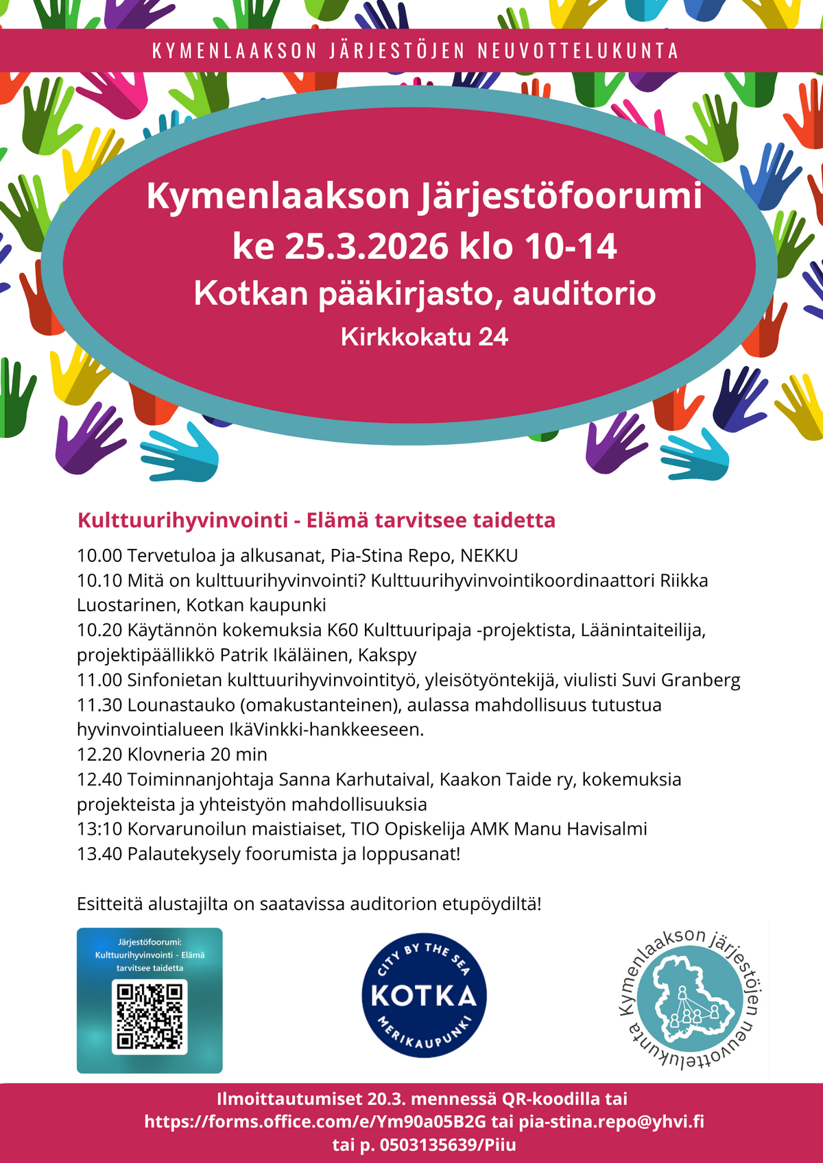 Kotkan pääkirjastolla 25.3.2026 klo 10-14 järjestettävän Kymenlaakson järjestöfoorumin järjestäjinä ovat Kymenlaakson järjestöjen neuvottelukunta ja Kotkan kaupunki. Kulttuurihyvinvintia käsittelevä foorumi on tarkoitettu järjestöille, hyvinvointialueen työntekijöille, päätöksentekijöille ja kuntalaisille. Se on maksuton, ilmoittautuneilla mahdollisuus omakustannelounaaseen.