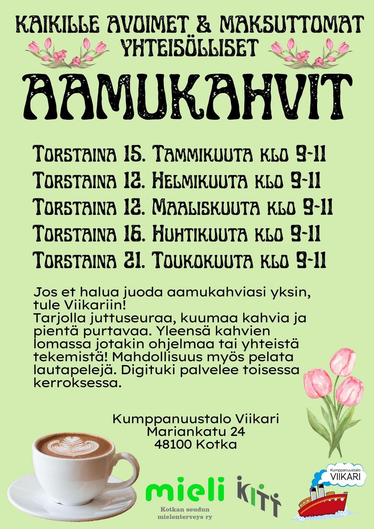 Ota talteen kevään 2026 Yhteisöllisten aamukahvien aikataulu Kumppanuustalo Viikarilla kerran kuussa torstaisin klo 9-11!
