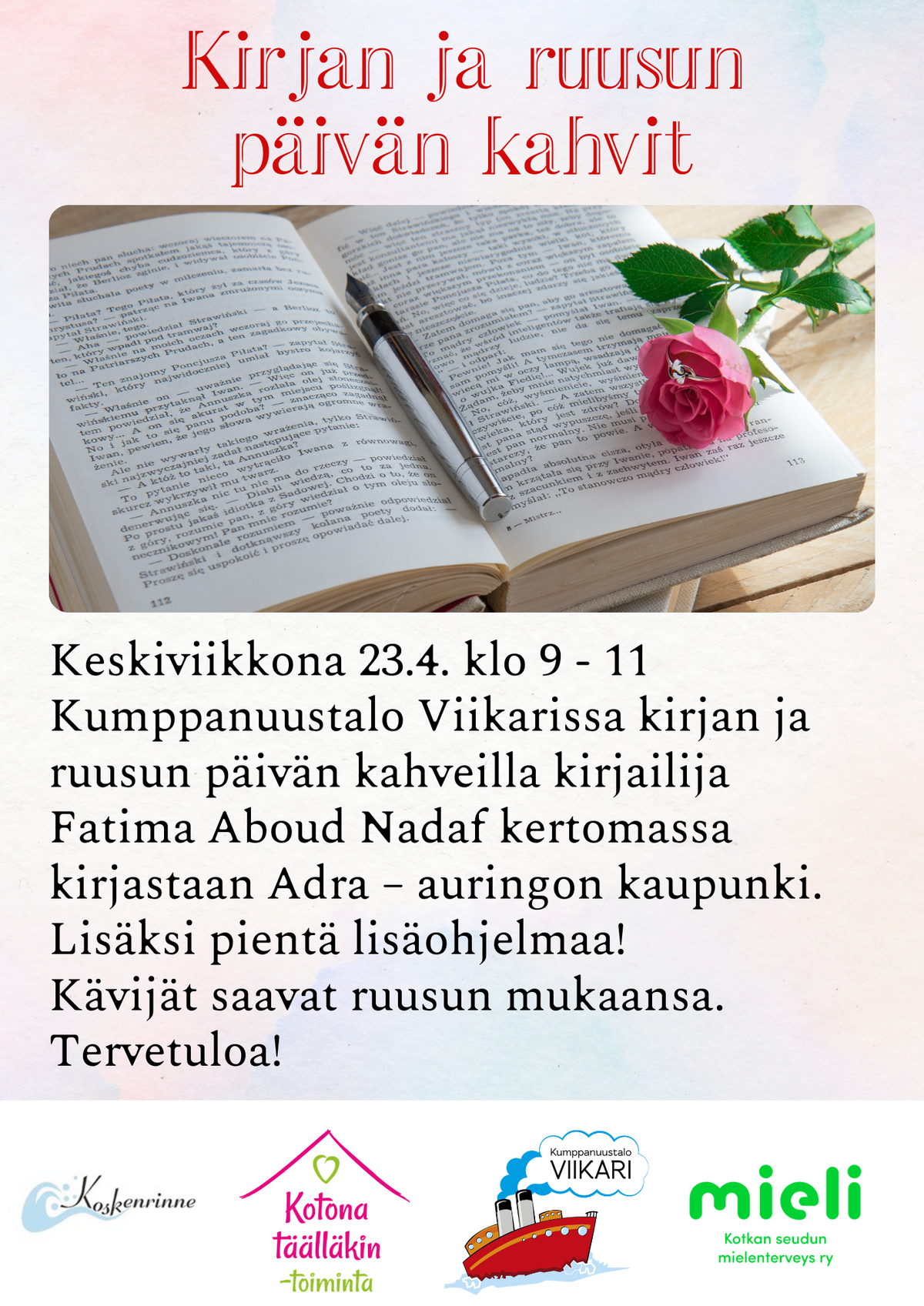 Kirjan ja Ruusun päivän kahveilla Viikarilla klo 9-11 kirjailija Fatima Aboud Nadaf kertoo kirjastaan Adra – auringon kaupunki. Lisäksi luvassa pientä lisäohjelmaa.