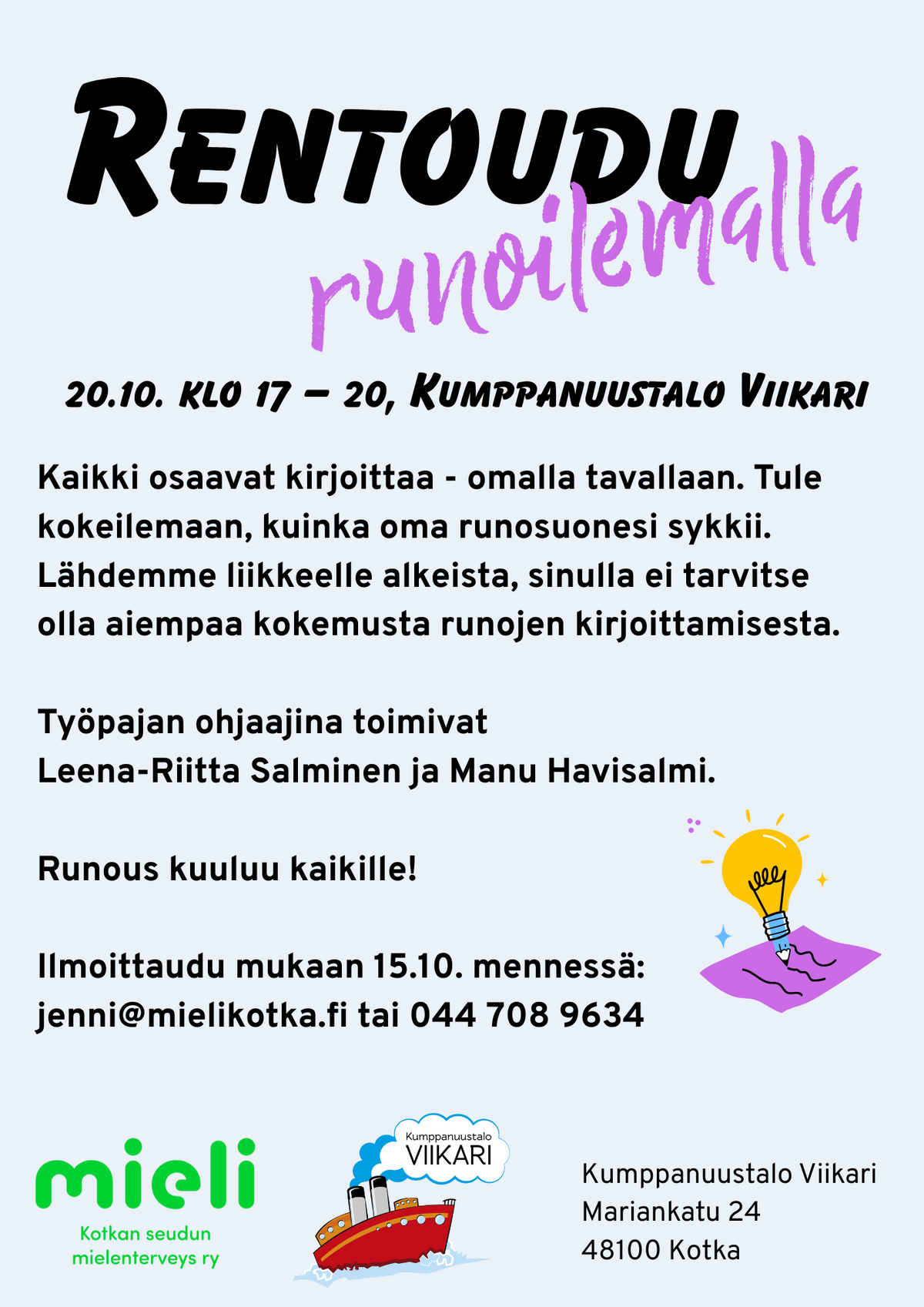 Tervetuloa runoilemaan Leena-Riitta Salmisen ja Manu Havisalmen lämpimässä ohjauksessa Kumppanuustalo Viikarille 20.10. klo 17-20! Ilmoittautua ehdit 15.10. saakka: jenni@mielikotka.fi tai p. 044 708 9634.