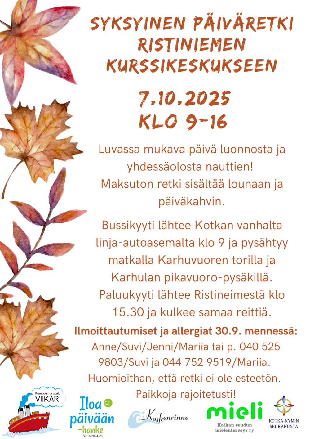 Tule mukaan syksyiselle päiväretkelle Ristiniemen kurssikeskukseen 7.10. klo 9-16.