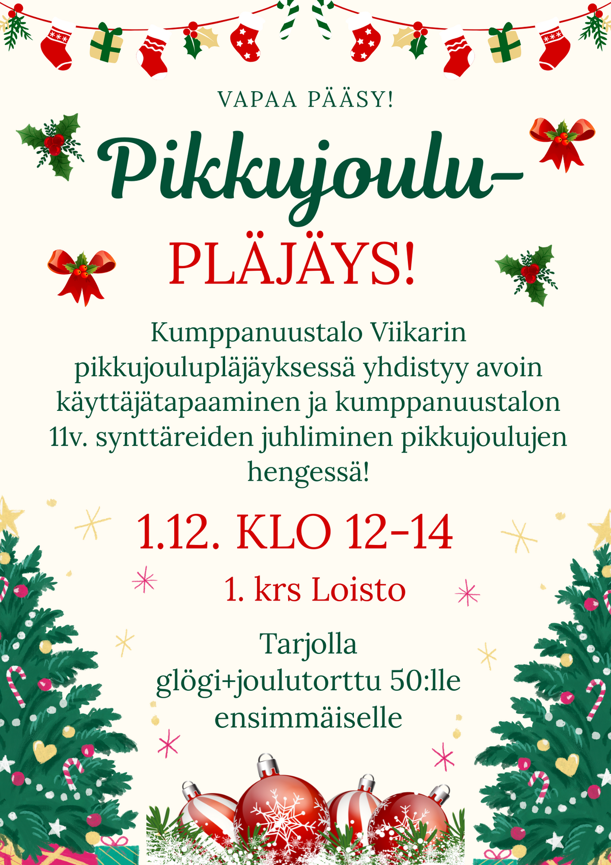 Tule mukaan Viikarin avoimeen käyttäjätapaamiseen ja 11v. synttäreiden juhlintaan pikkujoulujen hengessä 1.12. klo 12-14 alakerran Loistoon!